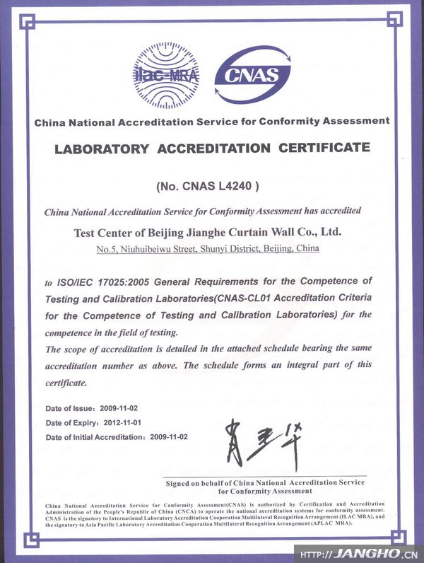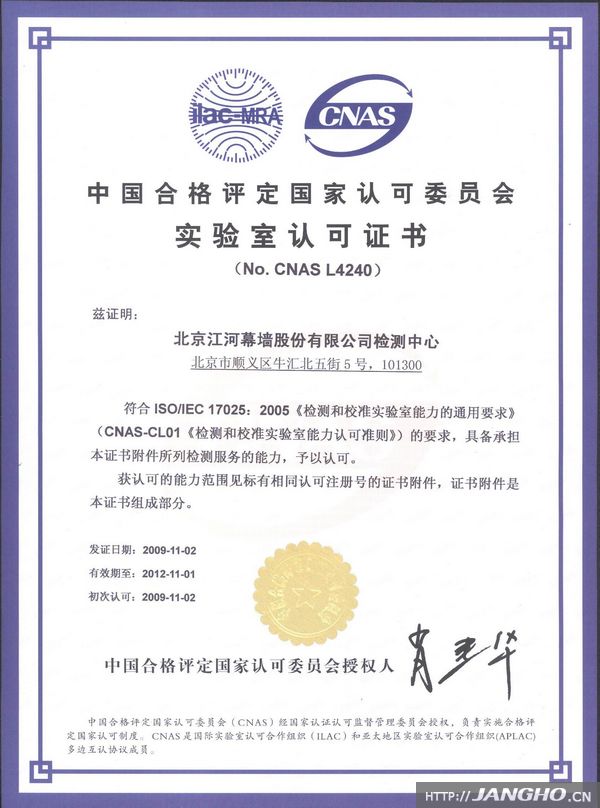 11月2日,北京江河幕墻股份有限公司檢測(cè)中心正式獲得中國(guó)合格評(píng)定國(guó)家認(rèn)可委員會(huì)CNAS實(shí)驗(yàn)室頒發(fā)的認(rèn)可資質(zhì)證書,標(biāo)志著江河幕墻檢測(cè)中心順利通過(guò)了國(guó)際ISO17025標(biāo)準(zhǔn)的認(rèn)可,綜合檢測(cè)能力得到行業(yè)組織的國(guó)家認(rèn)可,成為國(guó)內(nèi)幕墻企業(yè)首家通過(guò)CNAS評(píng)審的出口企業(yè)檢測(cè)中心,并成功列入國(guó)家獲準(zhǔn)實(shí)驗(yàn)室認(rèn)可機(jī)構(gòu)名錄。今后,檢測(cè)中心可在認(rèn)可檢測(cè)范圍內(nèi)使用CNAS實(shí)驗(yàn)室認(rèn)可標(biāo)志和ILAC國(guó)際互認(rèn)聯(lián)合標(biāo)志,并有機(jī)會(huì)參與國(guó)際合格評(píng)定機(jī)構(gòu)認(rèn)可雙邊、多邊合作交流。
